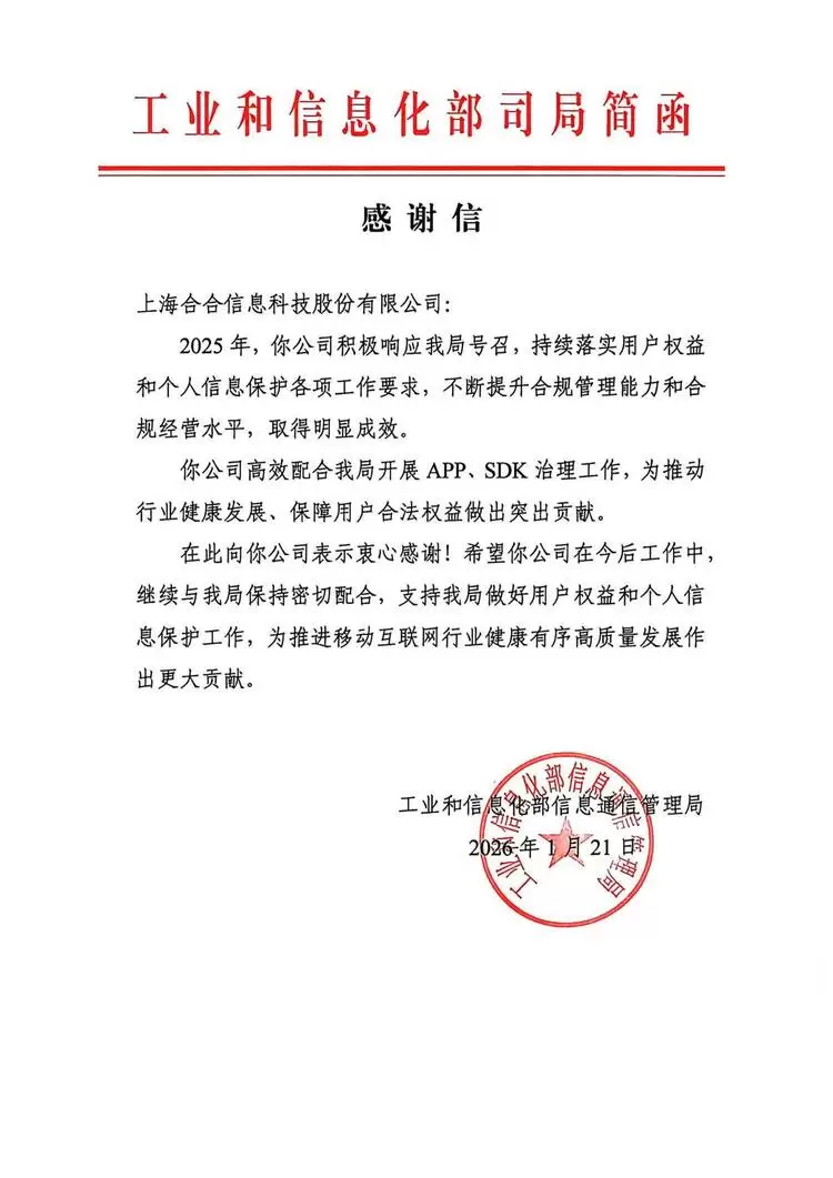 与此同时,扫描全能王母公司上海合合信息科技股份有限公司收到来自工信部司局的感谢信,信中对其旗下扫描全能王等产品在2025年积极响应号召、持续落实用户权益与个人信息保护工作、不断提升合规管理能力等方面取得的成效给予了充分肯定。工信部指出,合合信息高效配合开展APP、SDK治理工作,为保障用户合法权益、推动移动互联网行业健康发展做出了积极贡献。值得一提的是,母公司此前已获得首批“PIA二星级标识”认证,进一步印证了其在个人信息保护影响评估领域的领先实践。