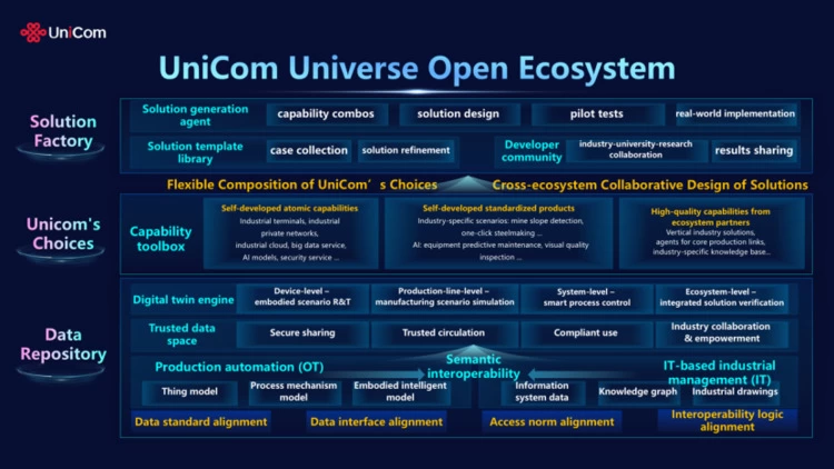 发布会上,中国联通正式发布Universe生态开放平台。该平台由“数据底仓”“联通优选”“解决方案工厂”三大模块构成,旨在实现数据要素安全流通、数智能力一体聚合与解决方案协同编排,推动跨界融合与生态共创。