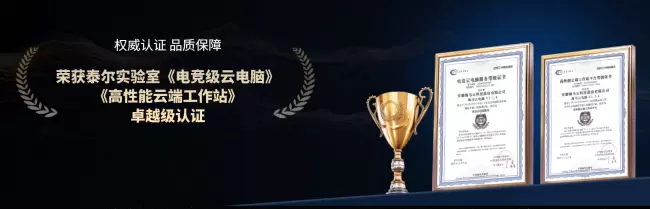 (图片:泰尔实验室向海马云电脑颁发《电竞级云电脑》《高性能云端工作站》卓越级认证证书)