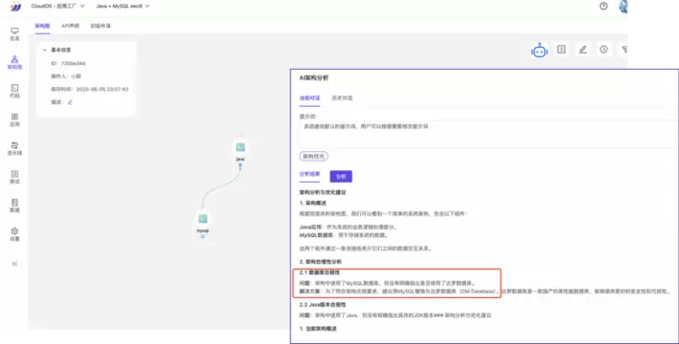 AI-CloudOS 内置企业架构规则库,可对生成的架构方案进行全维度 AI 分析,输出专业的分析报告与可落地的优化建议。