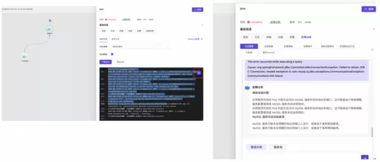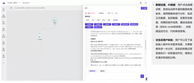 用户一键触发诊断后,系统将自动拉通日志数据、依赖组件信息、代码库信息等全维度数据,通过 AI 完成根因分析,输出可执行的处理建议。