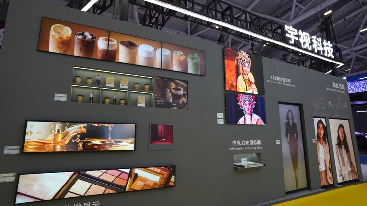 现场打造了沉浸式商业场景,呈现43寸超薄信发屏、94寸立式屏、LED海报屏等信发系统。LED海报屏采用GOB防护技术,支持多台级联 “合体”为无缝大屏;开箱即用的标准化部署,灵活适配连锁商超、零售广告等各类商用场景。