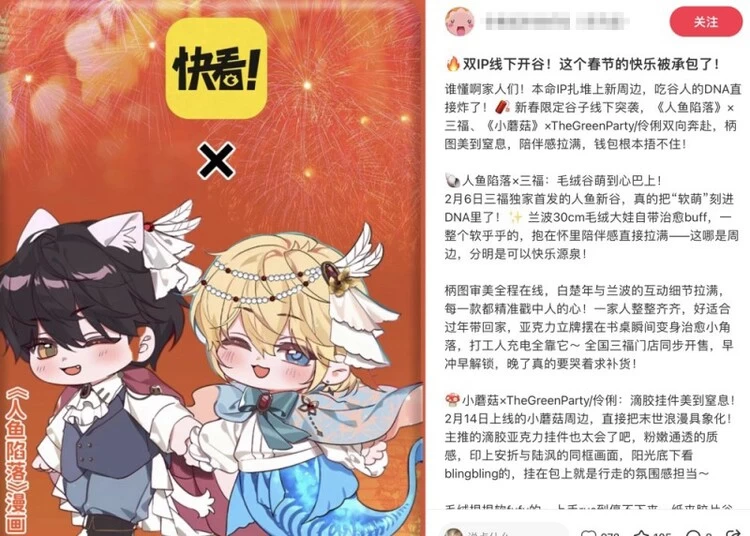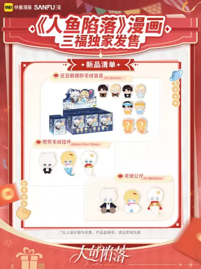 此次活动中,快看漫画与零售品牌三福展开独家合作,为《人鱼陷落》推出多款三福门店专属周边产品,包括毛绒娃、努努与豆豆眼主题盲盒等系列商品。这些产品在门店上线后迅速成为消费者关注焦点,成为本次吃谷节最受欢迎的周边品类之一。