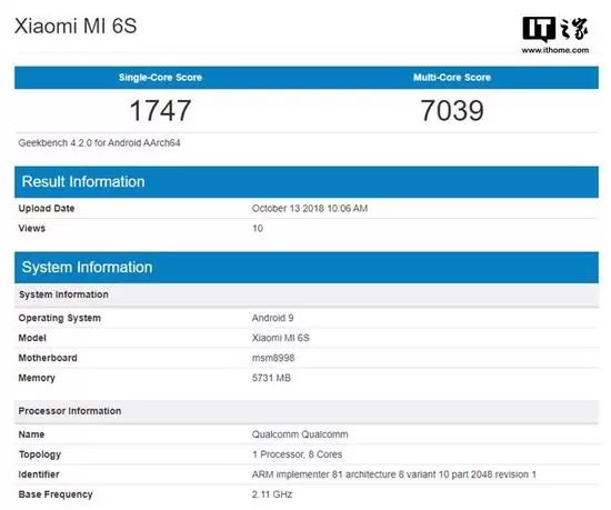 小米6S神秘现身Geekbench:搭载安卓9 Pie系统