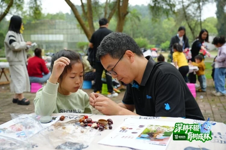在今年的活动中,咕咕狗不仅延续了植绿护绿的传统,更在形式上注入温情与创意。植树结束后,一场以“自然手作”为主题的亲子互动在草坪上展开。“果壳DIY”“石头彩绘”等环节吸引了员工与孩子参与,欢声笑语中,果壳变成风铃,石头化作画布。