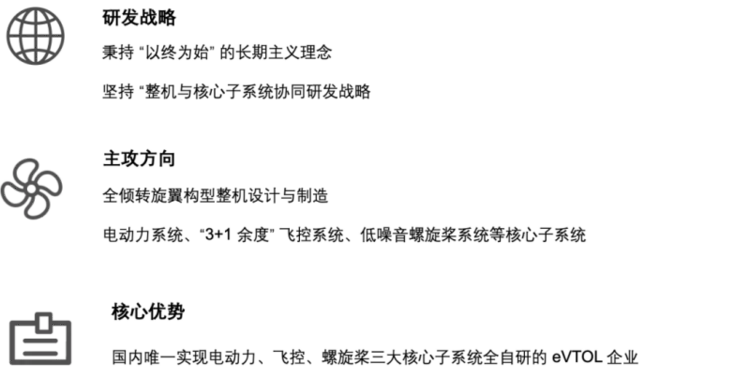公司愿景是以技术创新驱动产业升级,深耕中国市场、面向全球,为人类提供安全、高效、绿色的空中出行服务,助力中华民族的伟大复兴,力争成为全球最具竞争力的eVTOL航空科技企业。