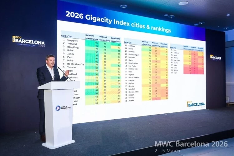【2026年3月3日,巴塞罗那】在MWC 2026期间,全球云网宽带产业协会(WBBA)举办BDC Barcelona 2026峰会(Broadband Development Congress)。在峰会上,WBBA总干事Martin Creaner与Omdia研究总监Michael Philpott代表双方联合发布最新的光网络《千兆城市发展指标 2026》数据模型,这是继去年BDC发布固网领域首个《千兆城市发展指标》后的第二期,2026年的排名在原有30城市基础上新增了20个城市,对全球范围内50个城市2025年全年的千兆网络发展情况进行分析及排名。