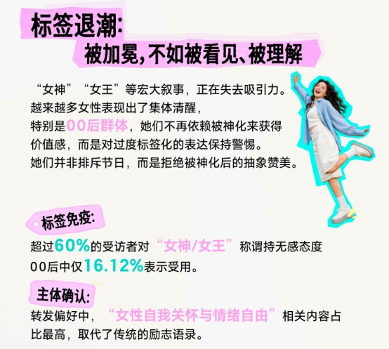 调研发现,超过六成受访者对“女神”“女王”等称谓持无感态度,00后中仅有16.12%表示受用。Soul 张璐认为,这并非女性拒绝节日祝福,而是她们更渴望被理解为具体的个体。围绕自我情绪、现实努力和生活节奏的讨论,比符号化的赞美更能带来温度与共鸣。