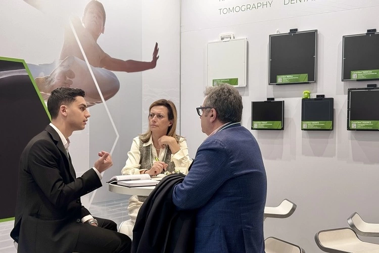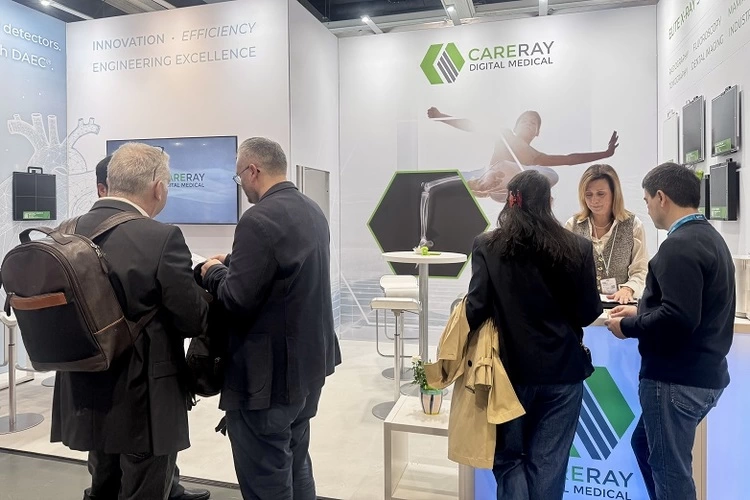 展会期间,康众医疗重点展示了覆盖医疗普放、乳腺、动态透视等多场景应用的数字化X射线平板探测器系列产品。首次在欧洲亮相的高速动态平板探测器CareView 1000RFZ,采用先进IGZO技术,具备99微米像素尺寸与3072×3072高分辨率,在保证图像细腻清晰的同时,实现更低辐射剂量成像。该产品支持高达30fps的全尺寸高帧频传输,可满足CBCT、TOMO等高速动态成像需求;304mm×304mm的大尺寸成像区域,为C-ARM应用提供更丰富的影像依据。