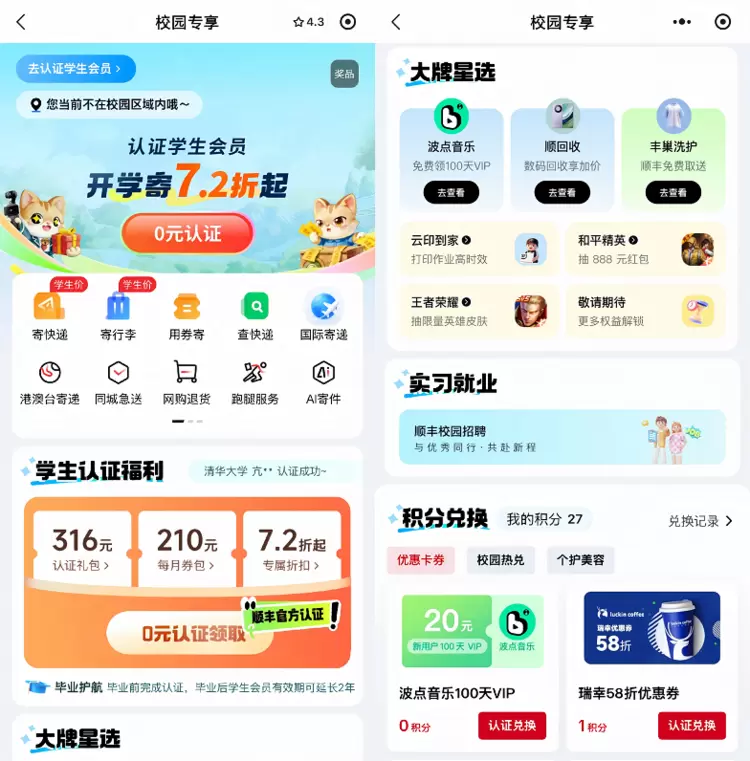 这份从容,从收到录取通知书那天就开始了。面向校园用户,顺丰推出了贯穿大学全程的学生会员体系。完成学生认证后,寄件7.2折起、每月定制券只是基础;顺丰校园平台还整合了各类生活权益,包括洗护优惠、大牌学生价、日用专属折扣等,价格低至9.9元起。此外,寄件积分可兑换实物,还有机会抽取热门游戏皮肤。真正打动年轻人的,是这份权益从大一延续到毕业后两年,不因毕业而终止,而是陪着他们从校园走到职场,完成人生阶段的过渡。