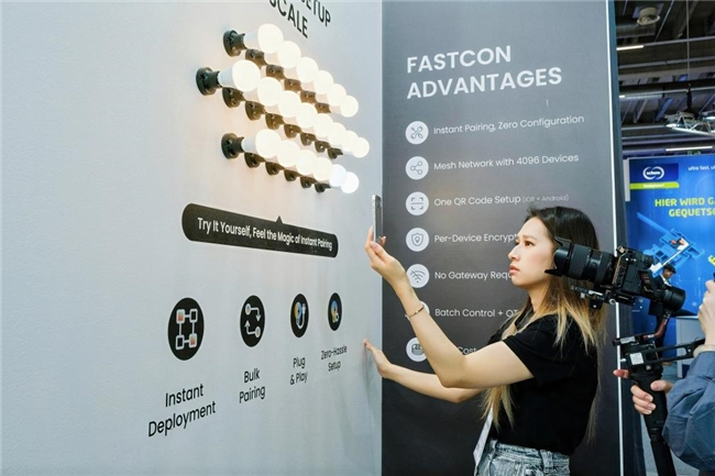 不论是行业解决方案、卓越的照明控制能力,还是Matter网桥的突破创新,都离不开博联自研通信协议FastCon的关键托举。展会现场,FastCon批量配网体验区,正一遍遍上演批量配网、即插即用的高效组网奇观,被现场观众形象地描述为“像开灯一样简单”。