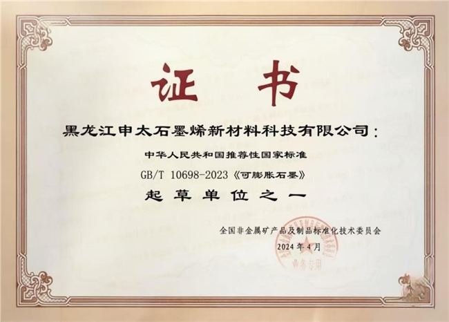 • 标准制定:作为国家级标准起草单位,申太石墨烯联合上海利物盛集团的技术专家,参与起草GB/T 10698-2023《可膨胀石墨》,将集团在石墨提纯、膨胀工艺等方面的技术积累转化为行业规范,推动我国可膨胀石墨产业标准化、高质量发展。