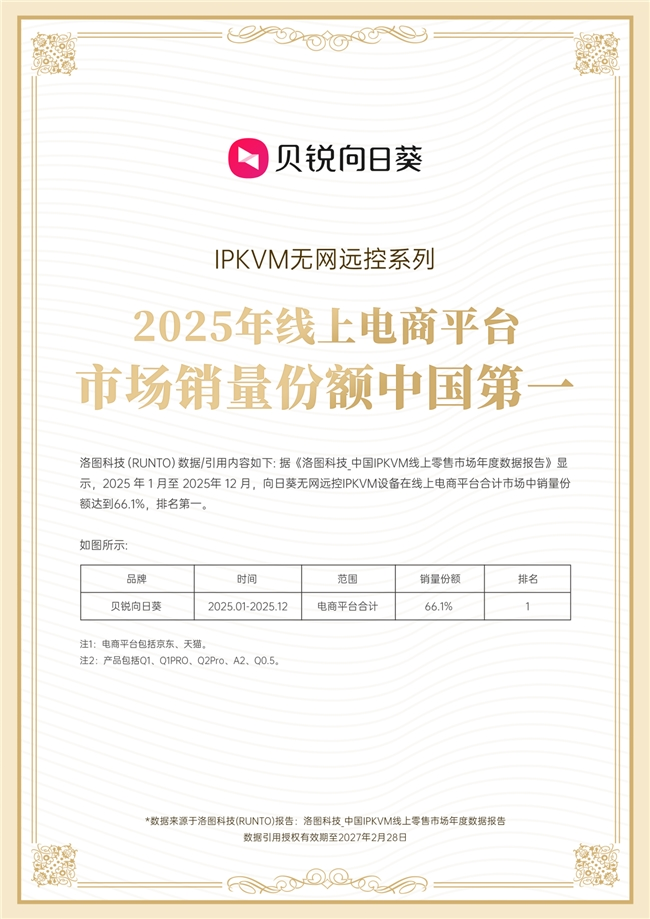 近日,根据知名数据调研机构洛图科技(RUNTO)发布的《中国IPKVM线上零售市场年度数据报告》显示,2025年1月至2025年12月,知名远程控制品牌“贝锐向日葵”旗下无网远控IPKVM系列设备,在中国线上电商平台(京东、天猫)合计市场中,销量份额达到66.1%,稳居行业第一。