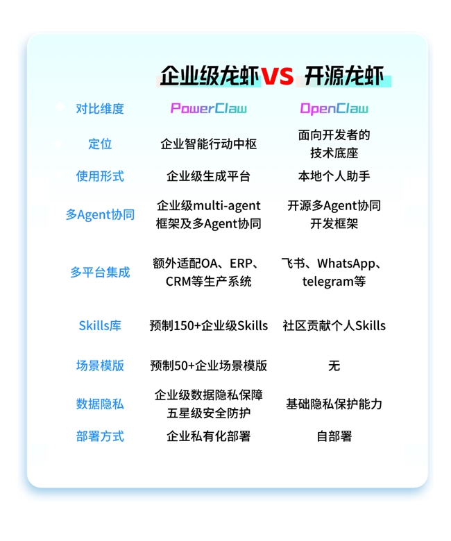不久前,中关村科金刚刚发布国内首个基于OpenClaw的企业级解决方案PowerClaw,通过在OpenClaw架构基础上完成企业级工程化升级,使智能体能够在企业环境中稳定运行,并具备权限控制、系统接入、企业技能以及安全管理等能力。换句话说,如果OpenClaw让开发者可以“养龙虾”,那么PowerClaw让企业也能够真正“养龙虾”。