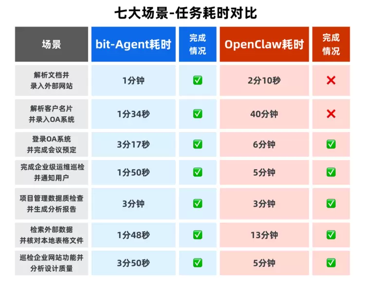 不难注意到,在两者共同跑通的场景里,bit-Agent的耗时皆优于OpenClaw,在个别场景中的耗时甚至不到后者的一半。