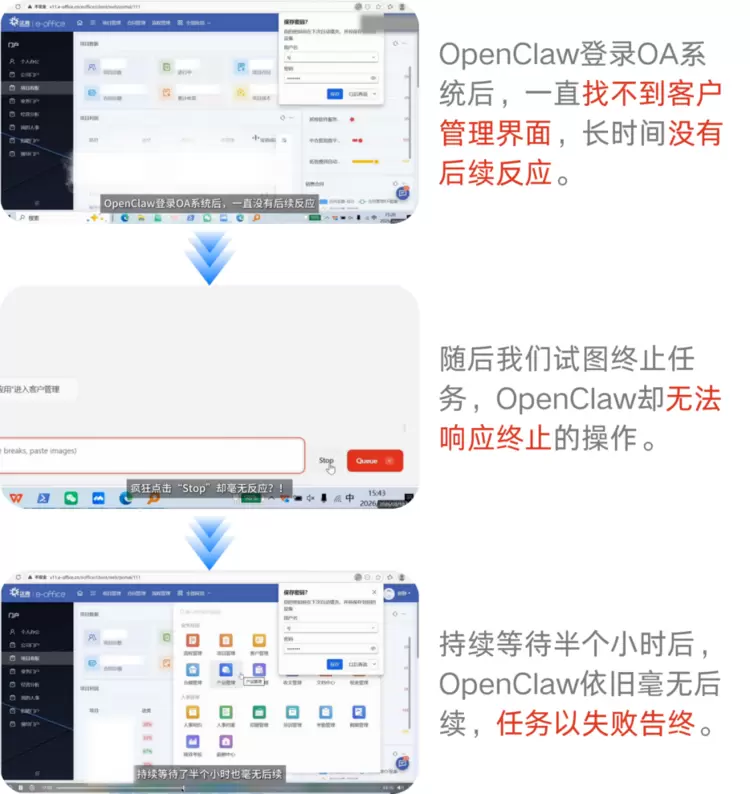 我们判断这是由于OpenClaw多模态数据处理与复杂GUI精准操作能力不足,无法支撑图像识别、表单录入等高要求任务。其缺少异常容错与流程重试机制,一旦环节执行失败就会直接卡死宕机,无法完成复杂业务操作。