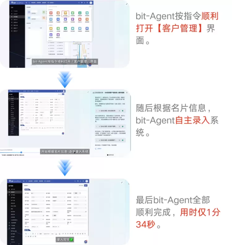 场景2:属于“系统写入+数据持久化”,需要在OA中新建客户、填写表单、提交录入,直接修改业务系统数据,操作精度和风险控制要求更高。