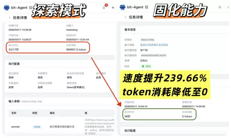 bit-Agent在使用“固化能力”后,token消耗降低为0,执行速度也提升了3倍。在高频且大批量的任务中,这种改进带来的降本效果将被无限放大。