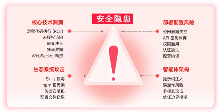 根据已公开信息,目前OpenClaw暴露的安全隐患来源于以下四大方面: