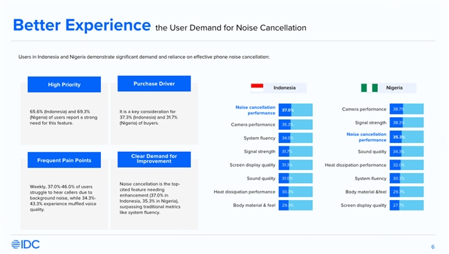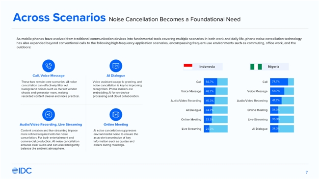 IDC调研显示,在印度尼西亚和尼日利亚,分别有65.6%和69.3%的用户对手机降噪功能存在强烈需求,约三分之一用户在选购手机时将降噪能力视为重要考量因素。同时,由于当地蓝牙耳机普及率较低,手机端内置降噪能力成为提升通话体验的关键解决方案。