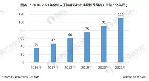 根据前瞻产业研究院发布的《2018-2023年全球人工智能芯片行业市场前瞻与投资战略规划分析报告》数据显示,2016年全球人工智能芯片市场规模达到36亿美元,预计到2021年将达到111亿美元,年复合增长率达到25%,增长迅猛,发展空间巨大。