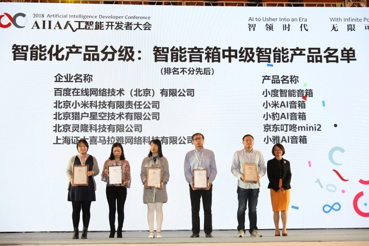 评估规范将智能音箱智能化程度一共分为六个等级:无智能、自动化、初级智能、中级智能、高级智能、完全智能。2018年8月AIIA开始首轮试评估征集工作,共有6家企业参与。经过技术测试、企业答辩、专家评审会评分,首批试评估共5家公司获得中级智能的证书,具体公司和产品名称如下(排名不分先后):
