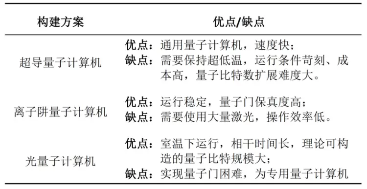 表1 三种量子计算机构建方案