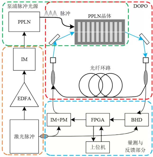 玻色量子公司开发的相干伊辛机(Coherent Ising Machine,CIM)是一款专用光量子计算机,具有常温光量子编码操控、全联接等方面的技术优势。该光量子计算机是一种混合量子计算系统,包含光学和电气两部分系统。其中,光学系统主要负责量子比特的制备与存储,电气系统主要负责量子比特的控制与计算。具体原理如图2所示。