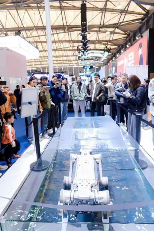 智身科技在AWE的亮相,不是单一产品的独秀,而是产品矩阵的集体亮相。从行业级小型四足机器人“钢镚L1”到高负载、轻体型、全防护的四足机器人“铜锤M1”,从观众可直接上手的跑酷体验到直接现场下水的IP67防水测试,从“春晚同款“的群控表演到电力巡检、应急救援等多个行业应用展示,这家公司的展台几乎涵盖了四足机器人所有可能的能力维度。