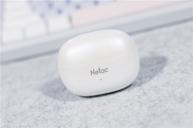朗科WTS1无线耳机的充电仓采用鹅卵石圆润造型设计,表面经过珍珠白烤漆工艺处理,触感非常的光滑细腻,在光线折射下呈现特别的光泽,而且抗指纹效果较好,正面印有朗科的徽标,下方为充电指示灯,背面为USB-C充电接口。