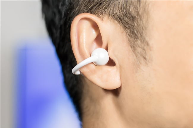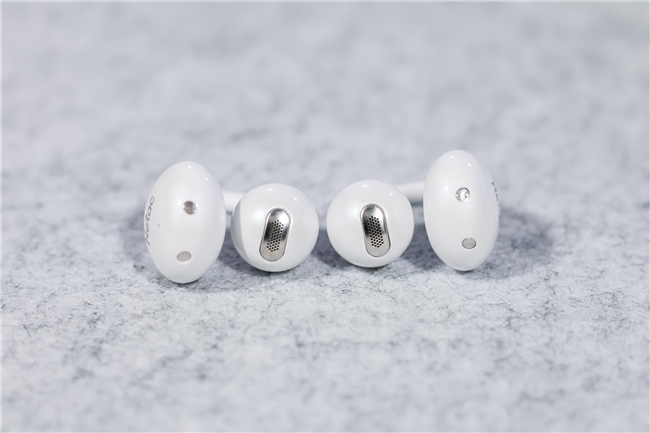 无线耳机的C型桥内嵌高韧性的钛合金材质,外层由软硅胶材质完全包裹,内侧圆形部分为发声腔体,无线耳机采用全新声学腔体设计,内置了12mm大尺寸动圈发声单元,能提供更强的低音效果与更丰富的声音细节,发声孔由金属防尘保护网覆盖。