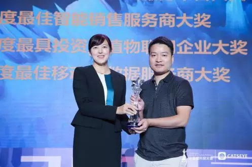 图:探迹科技荣获《2018Canton Tower the Best最佳智能销售服务商大奖》 (左:IDG中国区副总裁张莉,右:探迹科技CEO黎展) |