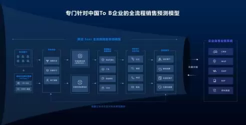 而AI的角色的作用就是基于大数据上的商业智能分析。在汇聚了企业内部数据和平台的第二方和第三方数据后,平台将描绘出多维度的企业客户画像,然后将结果转交给AI。这时,AI会利用销售预测模型,来对数据进行分析,找到企业客户的规律,发掘潜在企业客户,并预测其企业服务付费的倾向性。随后,平台再根据结果,排序并且展开舆情倾听与洞察,抓准每个企业最佳销售时机。