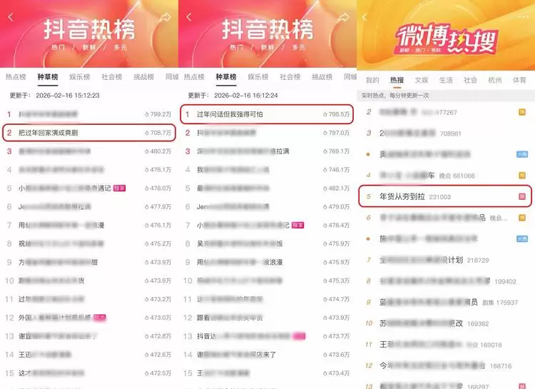 抖音和微博双双霸榜,热点冲上TOP2,直接把话题热度拉满:抖音话题 #把过年回家演成爽剧,子话题# 过年问话我强得可怕 不仅戳中了大家的情绪点,还稳稳拿下抖音种草榜第二;而微博话题 #年货从夯到拉# 也杀进热搜前五,品牌信息在高热讨论中强势露出,想不被看见都难!为后续的流量转化积累了认知基础。