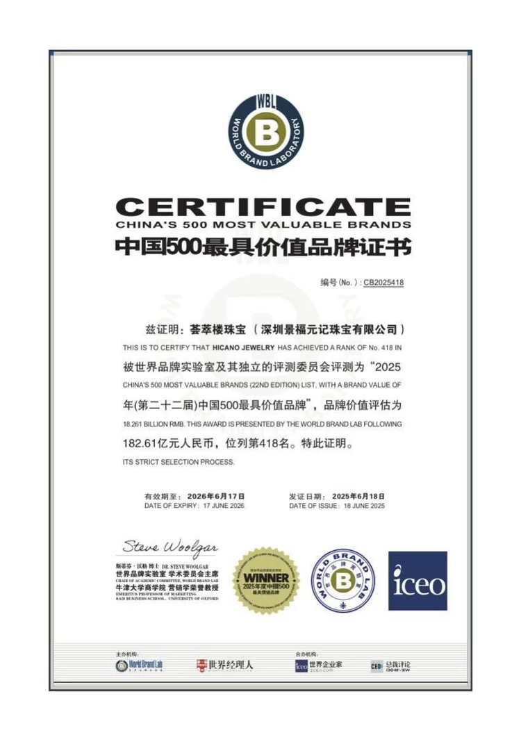 多年来,荟萃楼珠宝始终恪守诚信经营原则,依托深厚的品牌积淀稳步拓展市场,持续精进产品品质与服务体验。凭借持续深耕,品牌不仅连续多年在“3·15”国际消费者权益日及全国质量月活动中荣获权威认证,更相继斩获多项重磅殊荣,如:2020年荣膺“中国珠宝十大影响力品牌”,2024-2025年连续两年蝉联“年度(行业)全国连锁推荐品牌奖”,2025年更以182.61亿元的品牌价值成功跻身“中国500最具价值品牌”榜等。