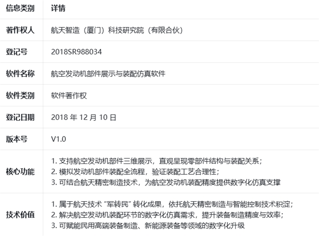 凭借在航空航天智能制造领域的持续深耕,技术成果转化再迎新突破。近日,航天智造(厦门)科技研究院(有限合伙)正式完成对航天级发动机部件装配仿真软件著作权(登记号:2018SR988034)的并购,进一步夯实了其在航空航天智能制造领域的技术壁垒,为航天技术“军转民”应用再添核心成果。