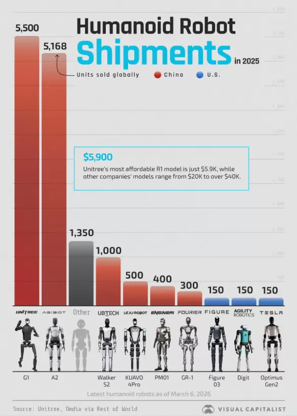 从企业出货量份额来看,中国企业表现突出。根据中国电子报发布的《2025年人形机器人市场研究报告》,宇树科技(Unitree)出货量和市场份额在全球排名第一,2025年出货量超过5500台。此外,宇树科技的产品在技术上也位居世界前列,价格也相对亲民。例如,其最便宜的R1型号售价仅为5900美元,而该公司还出售售价1600美元的机器狗。