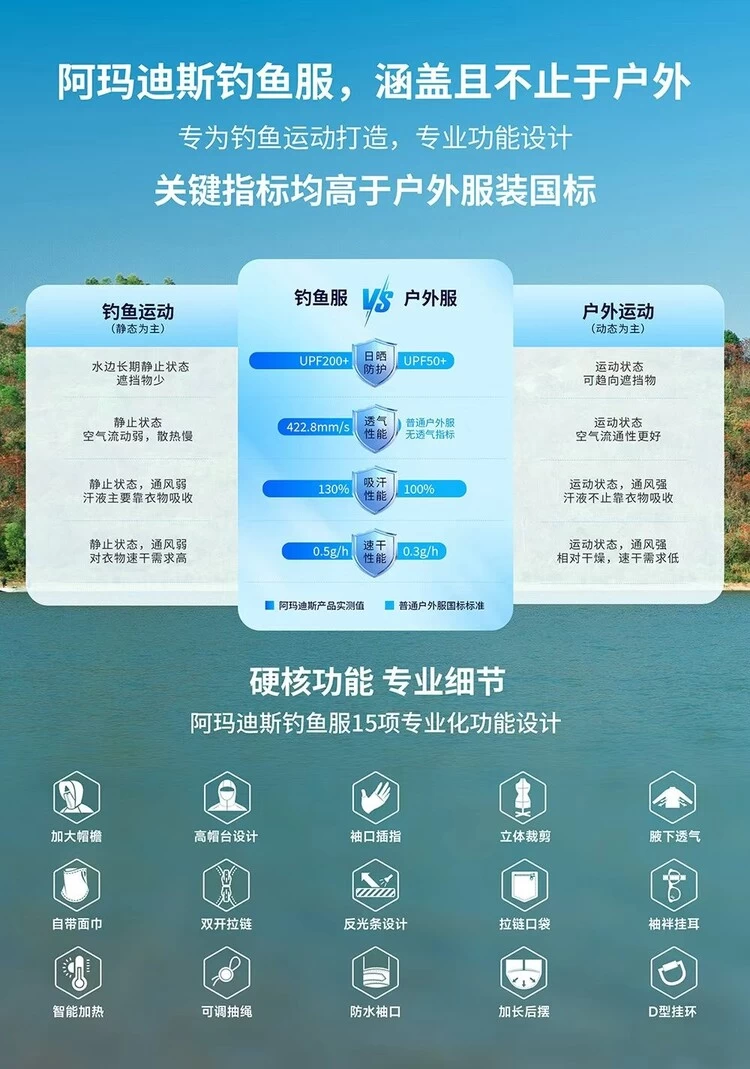 普通户外防晒服主打动态户外运动场景,而垂钓运动兼具“长时间静止”与“偶尔动态”的双重属性,水边无遮挡、易接触水与饵料、散热通风弱等特殊场景,都对服装的专业性能提出了更高要求。阿玛迪斯专业钓鱼服,就是为垂钓场景量身定制的“专属装备”。今天,我们通过核心指标,直观对比阿玛迪斯春夏款专业钓鱼防晒服与普通户外防晒服的差异,一次看懂专业与普通的本质区别: