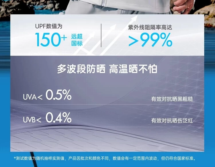 普通户外防晒服的防晒标准多为UPF50+,这是户外服装国标的常规要求,能满足动态运动中、有一定遮挡物场景的防晒需求。然而垂钓时的环境大多没有遮挡物遮挡,并且还有经水面反射的紫外线双重伤害,对防晒的需求更高,远超普通户外场景。