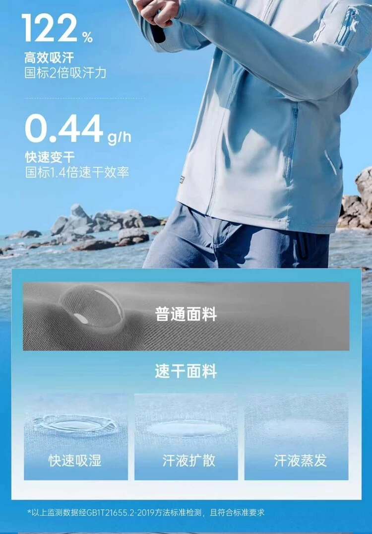 普通户外服针对动态运动设计,运动时空气流动大,身体处理相对干燥状态,对速干需求较低,速干性能一般为0.3g/h。而垂钓时,日晒、水边水汽又大,风又较小,汗液分泌多,且静止状态下衣物不易干燥。