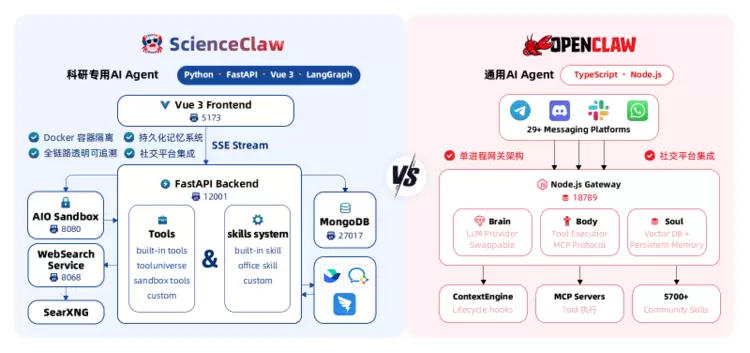 ScienceClaw 坚持核心技术自主研发,摒弃 OpenClaw 的旧有架构,从底层进行全面重新设计,基于 LangChain DeepAgents 架构与 AIO Sandbox 基础设施构建专属科研智能体体系,摆脱开源架构的通用化限制,在安全性、透明度、易用性上实现全方位质的飞跃,更贴合科研领域的技术使用需求,为科研工作者提供更专业、更稳定的智能体使用体验。