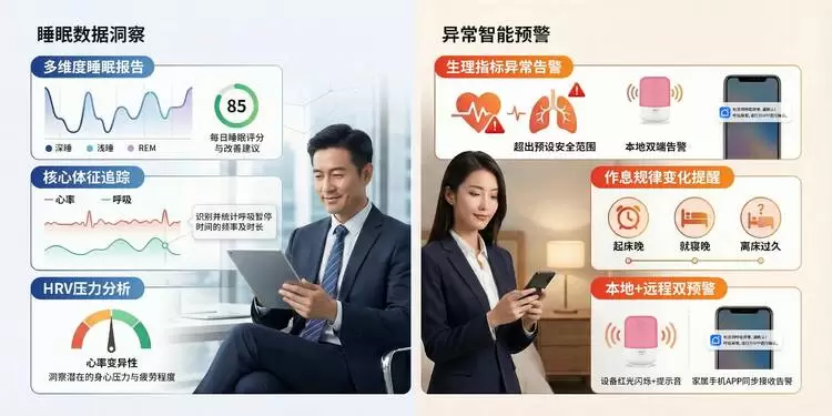 对于追求睡眠舒适度与安全性的中老年群体,传统穿戴式设备往往带来束缚感与心理负担。三思床头灯采用非接触式毫米波雷达传感器,以“零束缚、零操作、零负担”的方式,默默守护长辈的夜间安睡。设备可持续监测心率、呼吸频率,并能智能识别整夜呼吸暂停等异常事件。