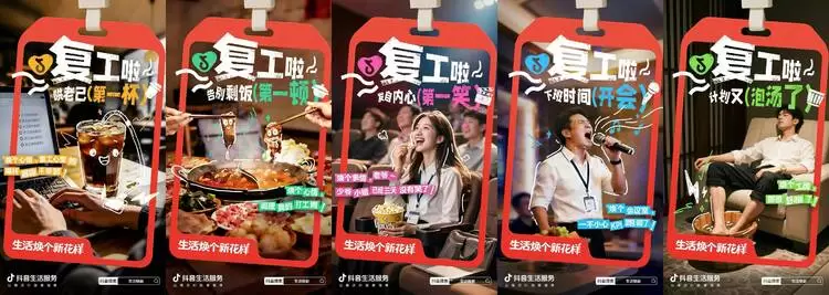 洞察复工后的真实情绪,结合咖啡、火锅、电影、KTV、按摩五个复工重点品类,以「复工品类+场景适配+情绪共鸣」为核心逻辑,打造复工系列日历海报,每天聚焦1个复工重点品类,将产品融入真实复工场景,精准贴合复工人群提神解压、便捷就餐、高效焕新的核心需求,深度击中「找回上班状态、需要复工仪式感」的情绪痛点。用轻松治愈的内容,将品牌主张「生活焕个新花样」深度植入用户心智。