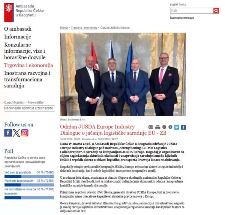 3月17日,由准时达欧洲(JUSDA Europe)联合捷克大使馆举办的“加强欧盟-西巴尔干物流合作”行业对话在贝尔格莱德举行。这场活动超越了常规的企业宣发,汇聚了跨国政企层面的核心决策者。