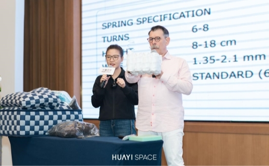 深耕床垫领域数十年的资深专家、华意空间高品质睡眠系统核心共建者雷蒙先生,是业内公认的睡眠系统专家。他不仅深谙床垫的材料科学、结构工艺与人体工学原理,更对消费者睡眠痛点与品质需求有着极为精准的洞察。在课程中,雷蒙先生现场拆解床垫,从弹簧系统到填充层,从面料选择到承托结构,将复杂的工艺细节一一呈现。他不仅传授了如何判断床垫品质的专业标准,更手把手教终端伙伴如何将这些专业价值转化为客户听得懂、能感知的睡眠解决方案。