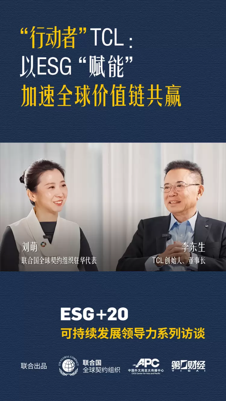 日前,TCL创始人、董事长李东生受邀参与联合国全球契约组织(UNGC)“ESG+20 可持续发展领导力系列访谈”,与联合国全球契约组织驻华代表刘萌展开深度对话,全面分享TCL在全球化运营中践行ESG理念、推动绿色低碳转型、带动产业链协同发展的实践与思考,展现中国科技制造企业以可持续发展助力全球价值链共赢的责任与担当。