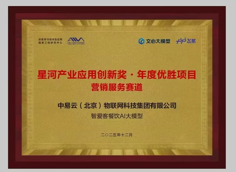 中易物联集团旗下“智爱客” 餐饮 AI 大模型,凭借在餐饮AI领域的创新实践与行业价值,荣获深度学习技术及应用国家工程研究中心颁发的“星河产业应用创新奖・年度优胜项目”。中易物联集团董事长、智爱客创始人雷钰云表示,此次获奖是对智爱客 “以 AI 创新重构餐饮新动能” 理念的权威肯定,标志着公司在餐饮AI及数字化转型服务领域的探索,已达到国家级行业标杆水平。