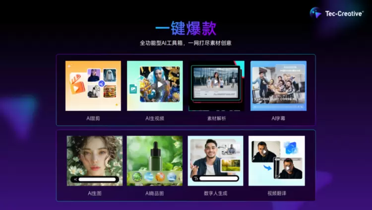 腾宇项目的成功,不是一次性的“AI炫技”,而是钛动科技自主研发的智能营销创意工具——Tec-Creative2.0的系统能力体现。这款以全球最前沿大模型为基座的创意工具,链接了全球主流数字媒体的GenAI技术引擎,覆盖文字、平面、音频、视频等全模态内容生成。其核心定位是“一键爆款”:以数据驱动效果,一键“无中生有”,带动爆款素材“无限裂变”。