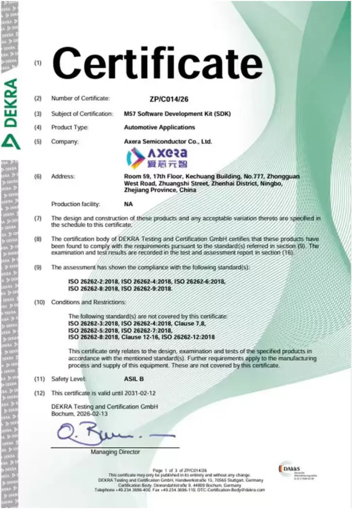近日,爱芯元智(股票代码:0600.HK)面向全球辅助驾驶市场推出的高性能车规级 M57 芯片配套软件套件(SDK),荣获由DEKRA德凯颁发的ISO26262功能安全ASIL B等级认证。作为爱芯元智此次认证项目的核心技术合作伙伴,上海秒尼科技术服务有限公司(MUNIK)凭借在汽车功能安全领域的专业能力与全开发过程技术服务,深度参与并助力该软件栈达成国际领先的安全合规标准。