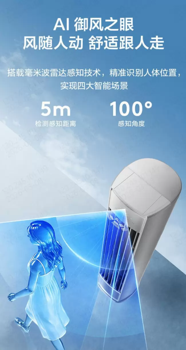 传统空调长期面临送风不均、直吹不适、送风范围不够等痛点,TCL小蓝翼·全域风ProAI健康舒适空调通过技术创新实现了根本性突破。其核心在于搭载了AI御风之眼睡眠科技,内置毫米波雷达,对人体位置与移动轨迹的精准识别。基于此,空调能自动调节风向,实现“风随人动”的智能送风模式——人近则风柔,人远则风强,真正实现个性化风感定制。无论是客厅中的走动,还是卧室内的休息,气流始终贴合人体需求,避免冷热不均与风感不适。